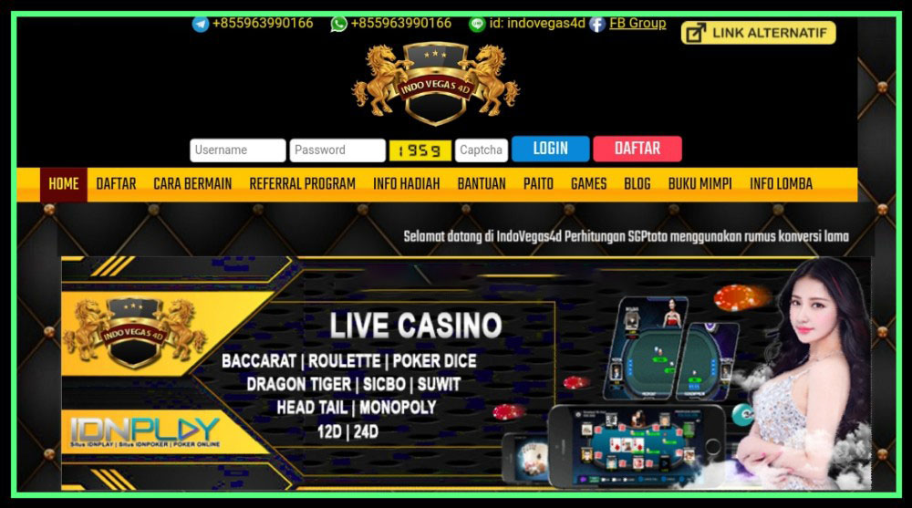 IndoVegas4D adalah salah satunya agen bandar togel wla terhebat dan paling besar di Indonesia. Situs ini sudah terbukti aman dan paling dipercaya hingga pantas sebagai tempat bermain togel online. Berapa saja kemenangan anda akan di bayar di sini, sebab Indo Vegas4D bukan BO kaleng-kaleng tetapi salah BO paling dipercaya yang dari 4DPrize Grup. Apakah itu 4DPrize Grup?, yakni salah satunya grup Bandar togel paling dipercaya yang tentu saja sudah bisa dibuktikan dan terbukti keamanannya dan di yakin oleh beberapa pemain togel Indonesia. Jadi anda bisa bermain dengan nyaman dan tidak perlu takut apabila anda bermain di sini.